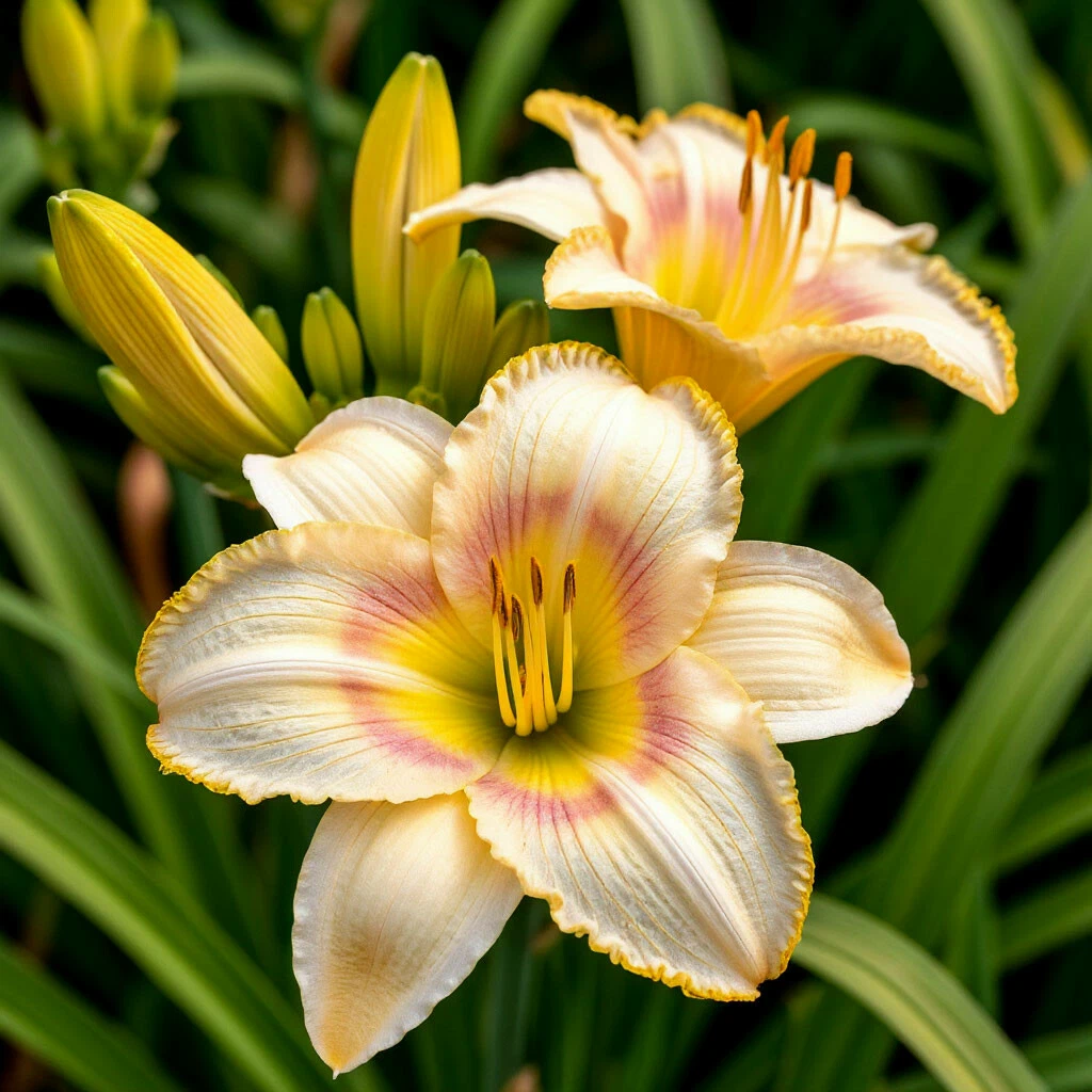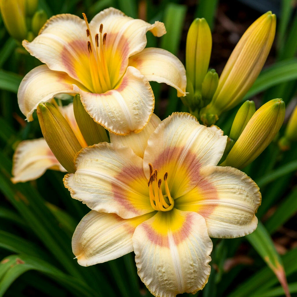 Защита от вредителей и болезней: Лилейники относительно устойчивы к вредителям и болезням, но иногда могут поражаться слизнями, тлей или ржавчиной. При необходимости применяют соответствующие меры защиты.